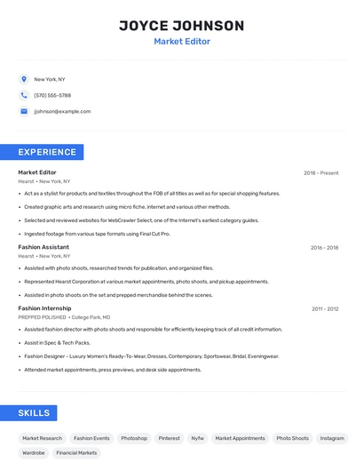 Build a professional market editor resume in minutes. Browse through our resume examples to identify the best way to word your resume. Then choose from 5+ resume templates to create your market editor resume.