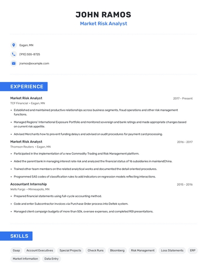 Build a professional market risk analyst resume in minutes. Browse through our resume examples to identify the best way to word your resume. Then choose from 5+ resume templates to create your market risk analyst resume.