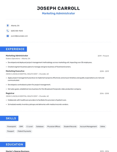 Build a professional marketing administrator resume in minutes. Browse through our resume examples to identify the best way to word your resume. Then choose from 5+ resume templates to create your marketing administrator resume.