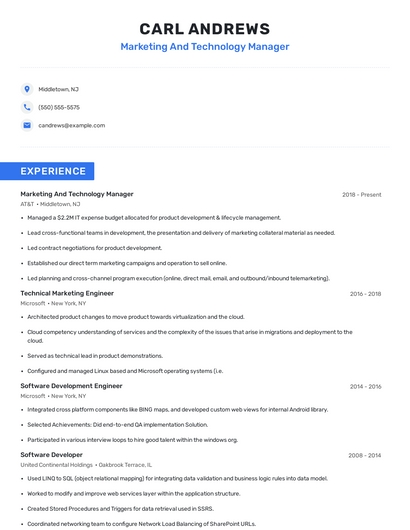 Build a professional marketing and technology manager resume in minutes. Browse through our resume examples to identify the best way to word your resume. Then choose from 5+ resume templates to create your marketing and technology manager resume.