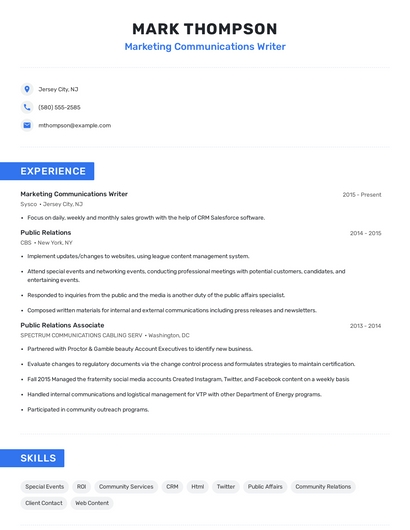 Build a professional marketing communications writer resume in minutes. Browse through our resume examples to identify the best way to word your resume. Then choose from 5+ resume templates to create your marketing communications writer resume.