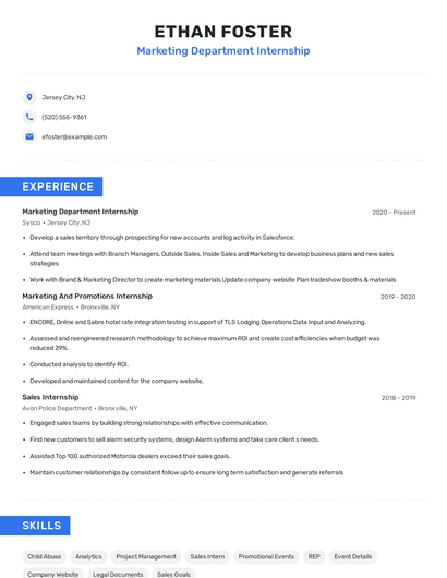 Build a professional marketing department internship resume in minutes. Browse through our resume examples to identify the best way to word your resume. Then choose from 5+ resume templates to create your marketing department internship resume.