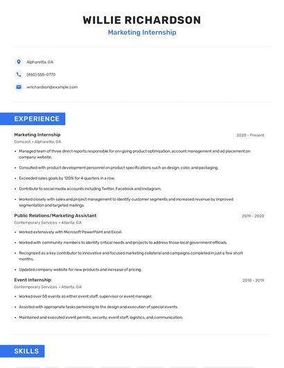 Build a professional marketing internship resume in minutes. Browse through our resume examples to identify the best way to word your resume. Then choose from 5+ resume templates to create your marketing internship resume.