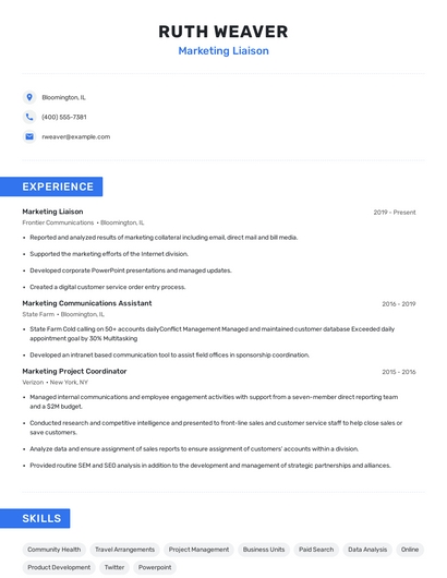 Build a professional marketing liaison resume in minutes. Browse through our resume examples to identify the best way to word your resume. Then choose from 5+ resume templates to create your marketing liaison resume.