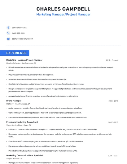 Build a professional marketing manager/project manager resume in minutes. Browse through our resume examples to identify the best way to word your resume. Then choose from 5+ resume templates to create your marketing manager/project manager resume.
