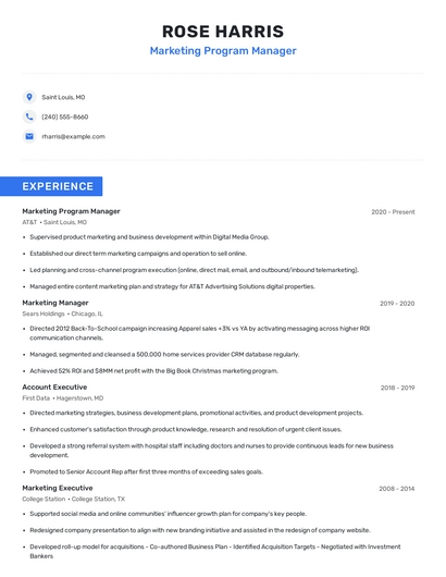 Build a professional marketing program manager resume in minutes. Browse through our resume examples to identify the best way to word your resume. Then choose from 5+ resume templates to create your marketing program manager resume.