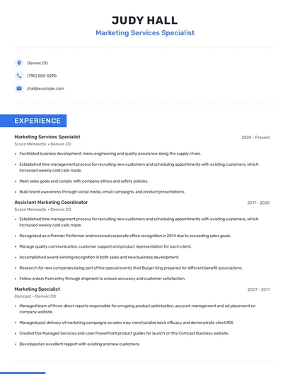 Build a professional marketing services specialist resume in minutes. Browse through our resume examples to identify the best way to word your resume. Then choose from 5+ resume templates to create your marketing services specialist resume.