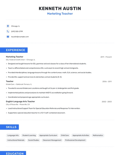 Build a professional marketing teacher resume in minutes. Our AI resume writing assistant will guide you through every step of the process, and you can choose from 10+ resume templates to create your marketing teacher resume.7. Professional Practice