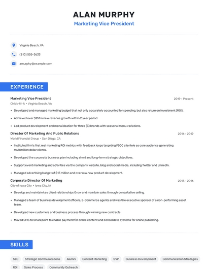 Build a professional marketing vice president resume in minutes. Browse through our resume examples to identify the best way to word your resume. Then choose from 5+ resume templates to create your marketing vice president resume.