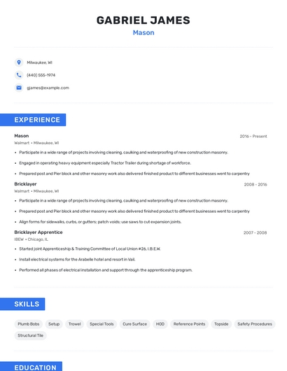 Build a professional mason resume in minutes. Browse through our resume examples to identify the best way to word your resume. Then choose from 5+ resume templates to create your mason resume.