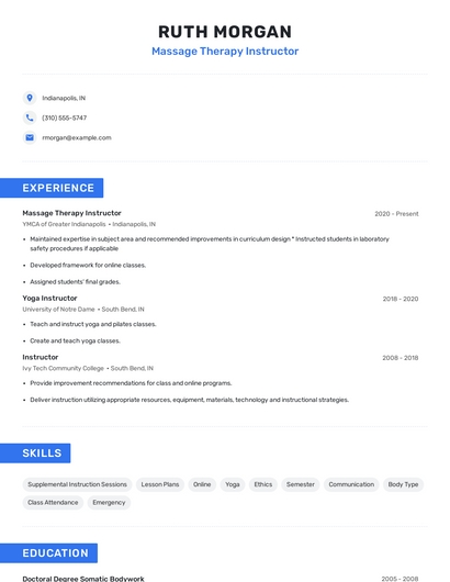 Build a professional massage therapy instructor resume in minutes. Browse through our resume examples to identify the best way to word your resume. Then choose from 5+ resume templates to create your massage therapy instructor resume.