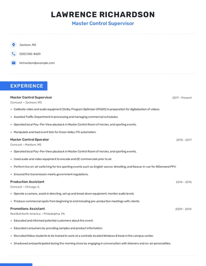 Build a professional master control supervisor resume in minutes. Our AI resume writing assistant will guide you through every step of the process, and you can choose from 10+ resume templates to create your master control supervisor resume.7. On-Air Operations