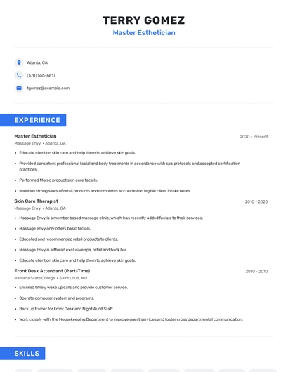 Build a professional master esthetician resume in minutes. Browse through our resume examples to identify the best way to word your resume. Then choose from 5+ resume templates to create your master esthetician resume.