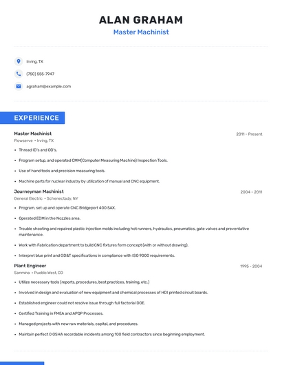 Build a professional master machinist resume in minutes. Browse through our resume examples to identify the best way to word your resume. Then choose from 5+ resume templates to create your master machinist resume.
