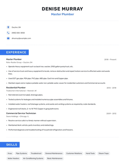 Build a professional master plumber resume in minutes. Browse through our resume examples to identify the best way to word your resume. Then choose from 5+ resume templates to create your master plumber resume.