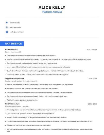 Build a professional material analyst resume in minutes. Browse through our resume examples to identify the best way to word your resume. Then choose from 5+ resume templates to create your material analyst resume.