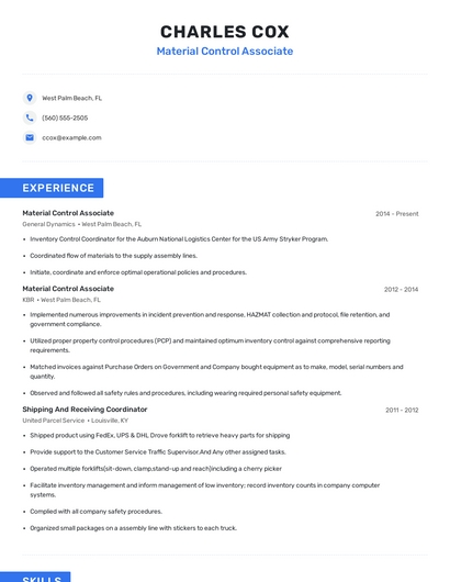 Build a professional material control associate resume in minutes. Browse through our resume examples to identify the best way to word your resume. Then choose from 5+ resume templates to create your material control associate resume.