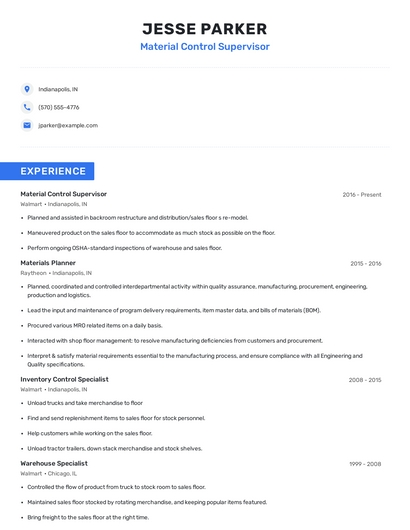 Build a professional material control supervisor resume in minutes. Our AI resume writing assistant will guide you through every step of the process, and you can choose from 10+ resume templates to create your material control supervisor resume.7. Shipping Receiving