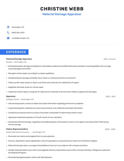 Build a professional material damage appraiser resume in minutes. Browse through our resume examples to identify the best way to word your resume. Then choose from 5+ resume templates to create your material damage appraiser resume.
