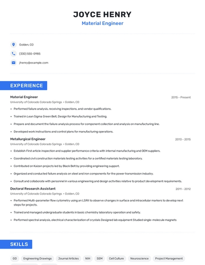 Build a professional material engineer resume in minutes. Browse through our resume examples to identify the best way to word your resume. Then choose from 5+ resume templates to create your material engineer resume.