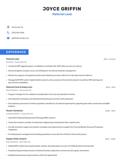 Build a professional material lead resume in minutes. Browse through our resume examples to identify the best way to word your resume. Then choose from 5+ resume templates to create your material lead resume.