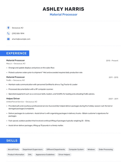 Build a professional material processor resume in minutes. Browse through our resume examples to identify the best way to word your resume. Then choose from 5+ resume templates to create your material processor resume.