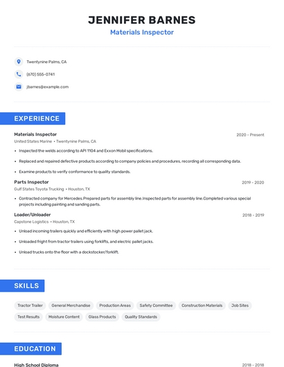 Build a professional materials inspector resume in minutes. Browse through our resume examples to identify the best way to word your resume. Then choose from 5+ resume templates to create your materials inspector resume.
