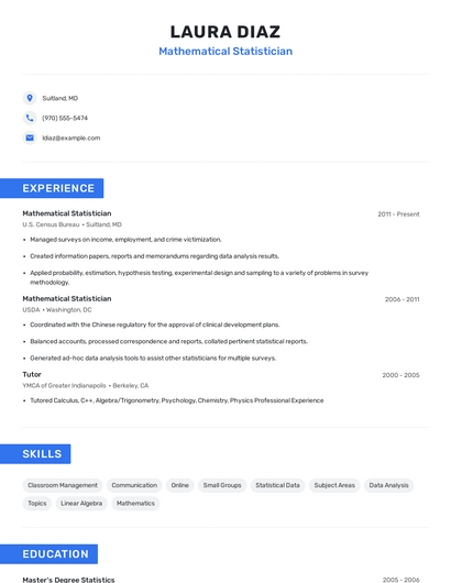 Build a professional mathematical statistician resume in minutes. Browse through our resume examples to identify the best way to word your resume. Then choose from 5+ resume templates to create your mathematical statistician resume.