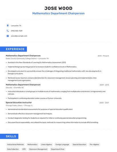 Build a professional mathematics department chairperson resume in minutes. Browse through our resume examples to identify the best way to word your resume. Then choose from 5+ resume templates to create your mathematics department chairperson resume.