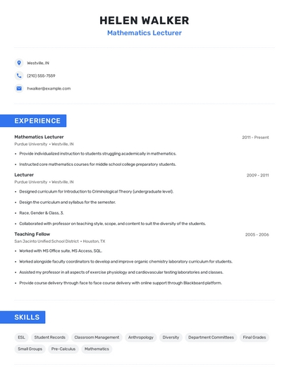 Build a professional mathematics lecturer resume in minutes. Browse through our resume examples to identify the best way to word your resume. Then choose from 5+ resume templates to create your mathematics lecturer resume.