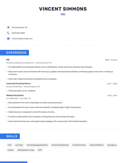 Build a professional md resume in minutes. Browse through our resume examples to identify the best way to word your resume. Then choose from 5+ resume templates to create your md resume.