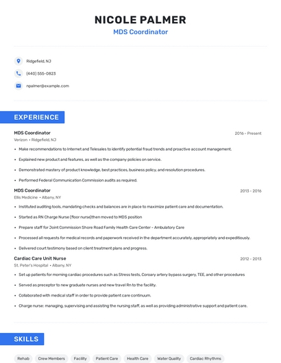 Build a professional mds coordinator resume in minutes. Browse through our resume examples to identify the best way to word your resume. Then choose from 5+ resume templates to create your mds coordinator resume.