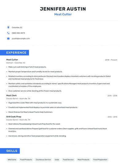 Build a professional meat cutter resume in minutes. Browse through our resume examples to identify the best way to word your resume. Then choose from 5+ resume templates to create your meat cutter resume.