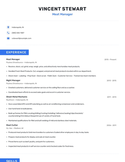 Build a professional meat manager resume in minutes. Browse through our resume examples to identify the best way to word your resume. Then choose from 5+ resume templates to create your meat manager resume.