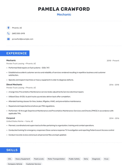 Build a professional mechanic resume in minutes. Browse through our resume examples to identify the best way to word your resume. Then choose from 5+ resume templates to create your mechanic resume.