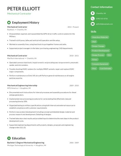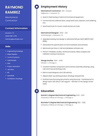 You can use Zippia's AI resume builder to make the resume writing process easier while also making sure that you include key information that hiring managers expect to see on a mechanical contractor resume. You'll find resume tips and examples of skills, responsibilities, and summaries, all provided by Zippi, your career sidekick.