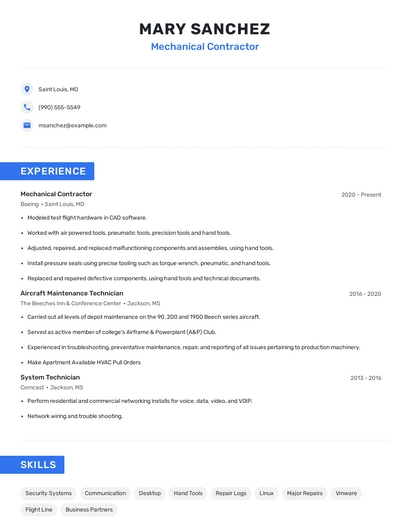 Build a professional mechanical contractor resume in minutes. Browse through our resume examples to identify the best way to word your resume. Then choose from 5+ resume templates to create your mechanical contractor resume.