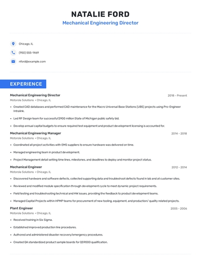Build a professional mechanical engineering director resume in minutes. Browse through our resume examples to identify the best way to word your resume. Then choose from 5+ resume templates to create your mechanical engineering director resume.