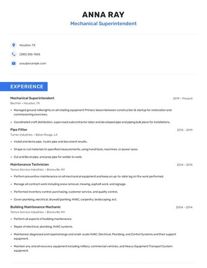 Build a professional mechanical superintendent resume in minutes. Browse through our resume examples to identify the best way to word your resume. Then choose from 5+ resume templates to create your mechanical superintendent resume.