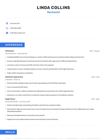 Build a professional mechanist resume in minutes. Our AI resume writing assistant will guide you through every step of the process, and you can choose from 10+ resume templates to create your mechanist resume.What skills help Mechanists find jobs?