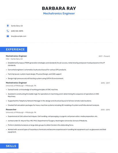 Build a professional mechatronics engineer resume in minutes. Browse through our resume examples to identify the best way to word your resume. Then choose from 5+ resume templates to create your mechatronics engineer resume.