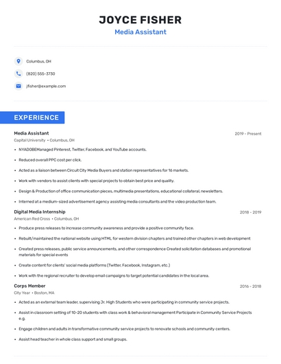 Build a professional media assistant resume in minutes. Browse through our resume examples to identify the best way to word your resume. Then choose from 5+ resume templates to create your media assistant resume.