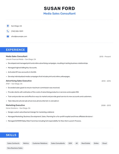 Build a professional media sales consultant resume in minutes. Browse through our resume examples to identify the best way to word your resume. Then choose from 5+ resume templates to create your media sales consultant resume.
