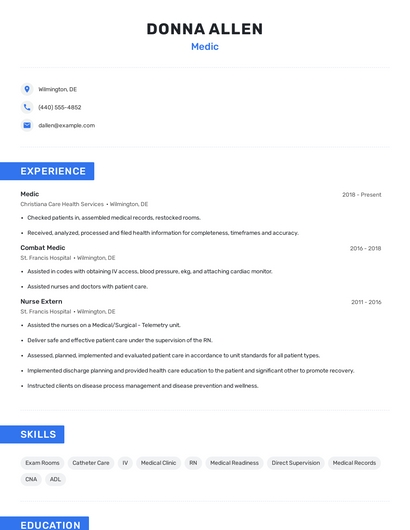 Build a professional medic resume in minutes. Browse through our resume examples to identify the best way to word your resume. Then choose from 5+ resume templates to create your medic resume.