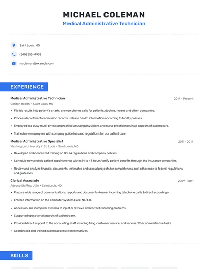 Build a professional medical administrative technician resume in minutes. Browse through our resume examples to identify the best way to word your resume. Then choose from 5+ resume templates to create your medical administrative technician resume.