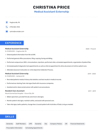 Build a professional medical assistant externship resume in minutes. Browse through our resume examples to identify the best way to word your resume. Then choose from 5+ resume templates to create your medical assistant externship resume.