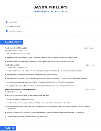 Build a professional medical assistant instructor resume in minutes. Browse through our resume examples to identify the best way to word your resume. Then choose from 5+ resume templates to create your medical assistant instructor resume.