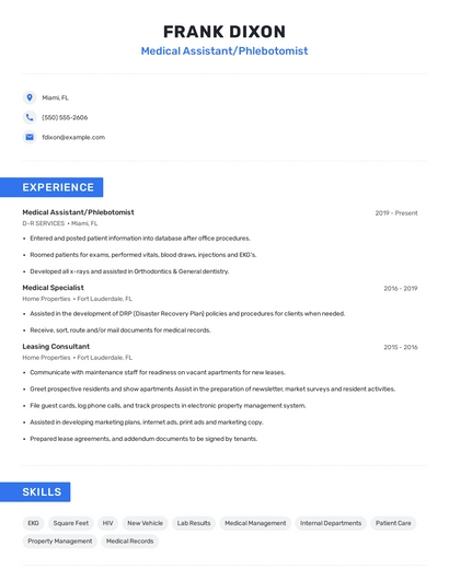 Build a professional medical assistant/phlebotomist resume in minutes. Browse through our resume examples to identify the best way to word your resume. Then choose from 5+ resume templates to create your medical assistant/phlebotomist resume.