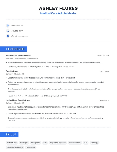 Build a professional medical care administrator resume in minutes. Browse through our resume examples to identify the best way to word your resume. Then choose from 5+ resume templates to create your medical care administrator resume.