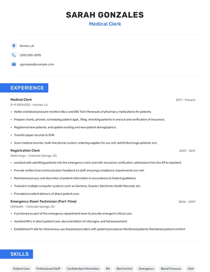 Build a professional medical clerk resume in minutes. Browse through our resume examples to identify the best way to word your resume. Then choose from 5+ resume templates to create your medical clerk resume.
